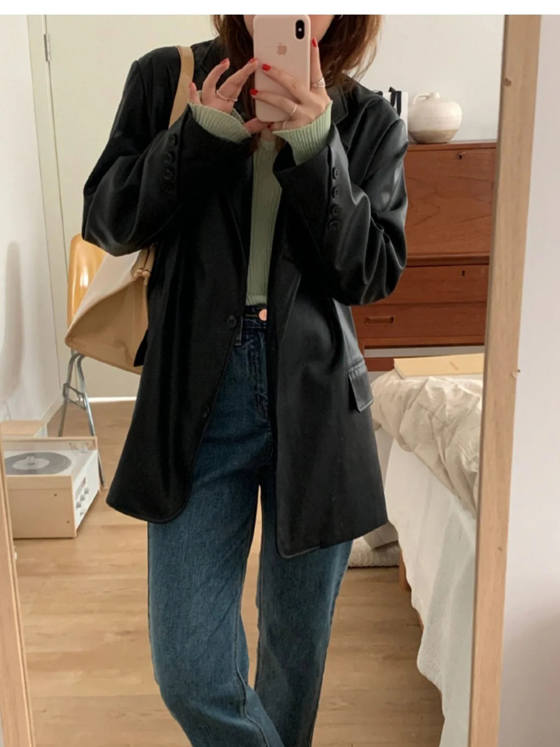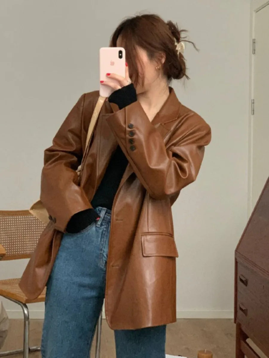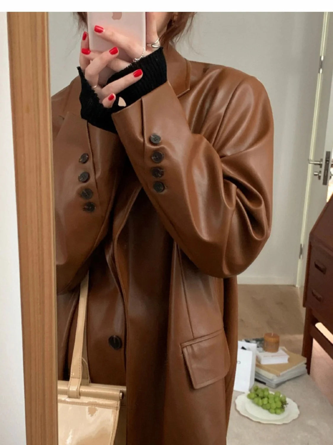 Crafted from high-quality PU leather, it offers a smooth, polished look while being durable and easy to maintain. The jacket’s tailored fit enhances your silhouette, and its mid-length design provides extra coverage without sacrificing style.